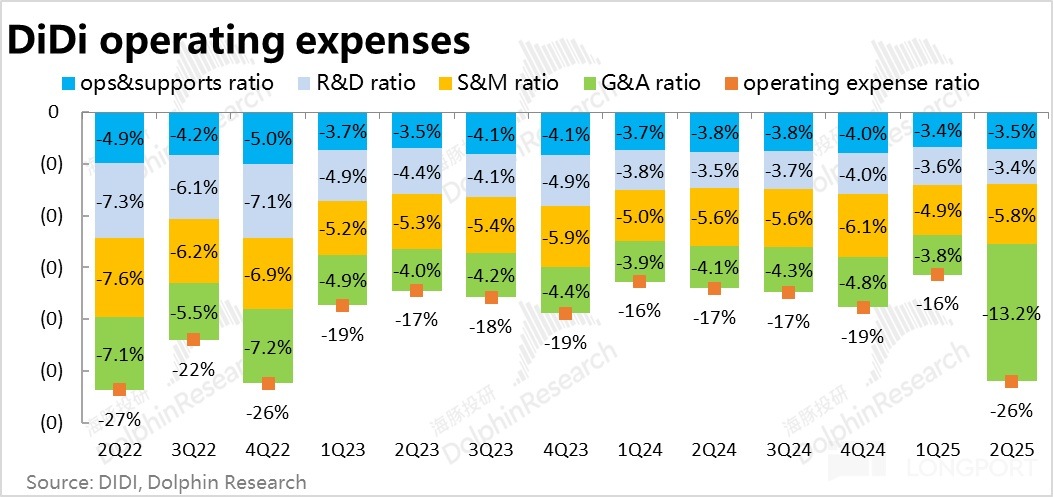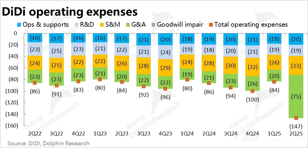從成本和費用角度看,滴滴本季的毛利率為 19.6%,同比和環比角度都有明顯的提升。由於滴滴成本中的很大部分就是對外分成,平台留存收益率的走高,自然就會導致毛利率的走高。因此毛利潤額 111 億,同比增長近 17%,高於市場預期的 107 億。