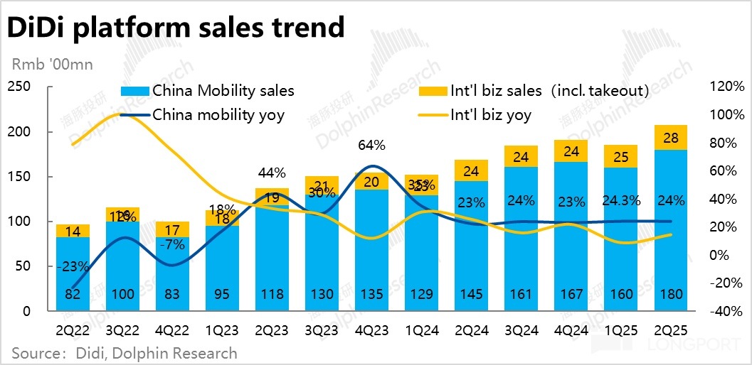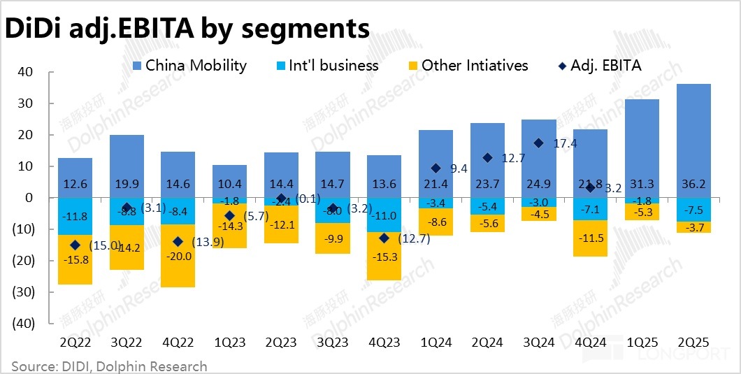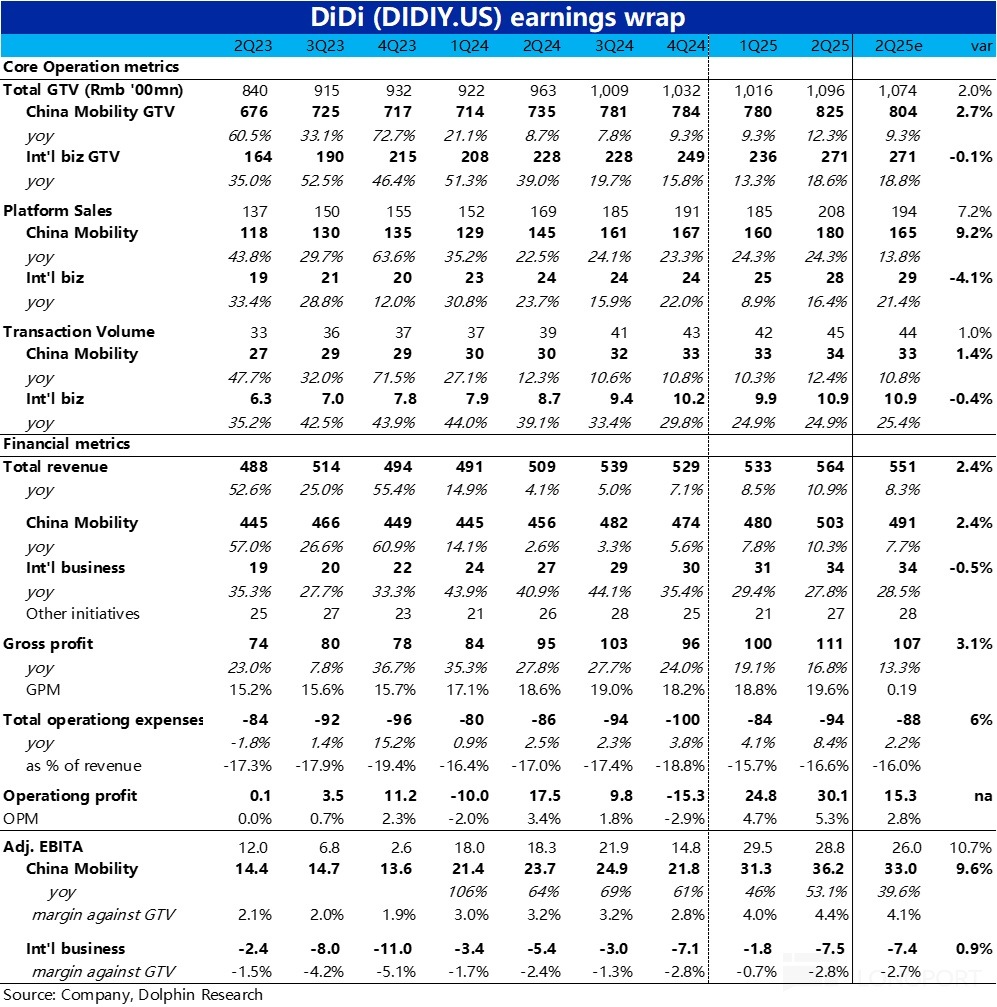 5、整體表現上,滴滴本季總營收約 564 億,同比增長 10.9%,跑贏市場預期的 551 億,主要有國内業務超預期的 GTV 增帶動。利潤端,因國内板塊利潤率超預期提升,國際業務虧損擴大也在預期内,整體調整後 EBITA 為 28.8 億,跑贏市場預期近 11%。