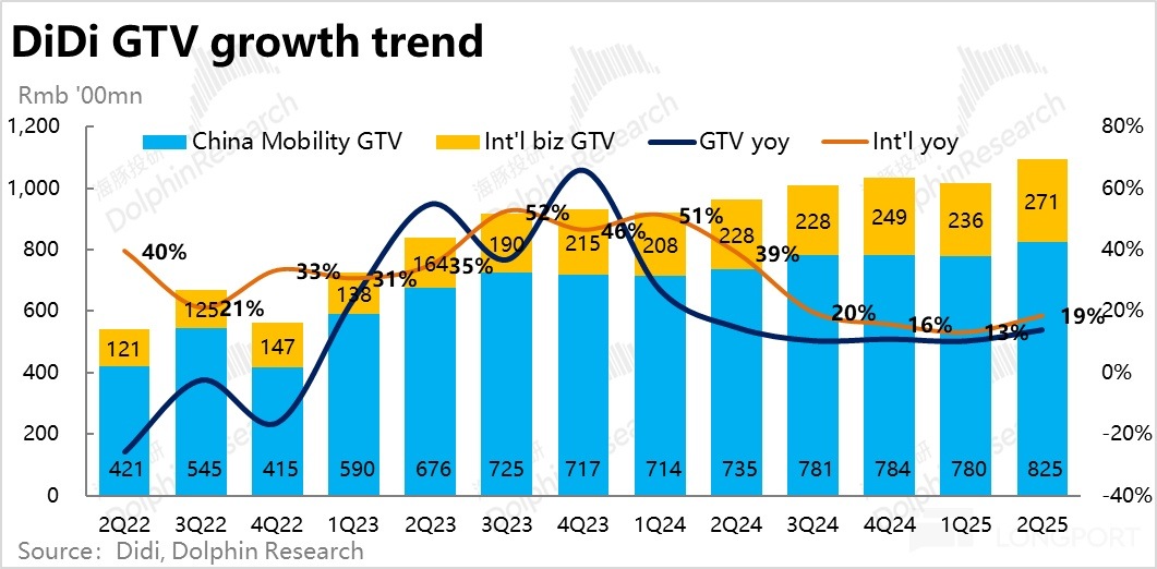 1、國内業務:核心運營數據上,本季度滴滴國内業務實現 GTV825 億,同比增速較上季小幅加速到 12.3%,比彭博一致預期稍高。對比交通部自 4 月以來重新發佈的網約車行業數據,滴滴自營業務(不包括花小豬和聚合業務)在 2Q 的表現和行業總單量增速情況大體一致。