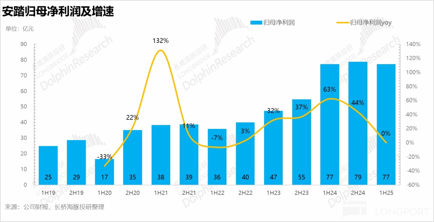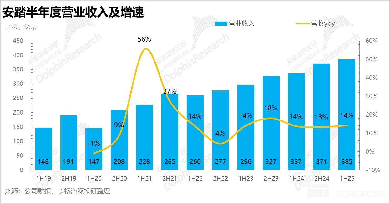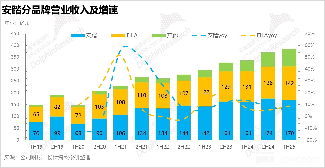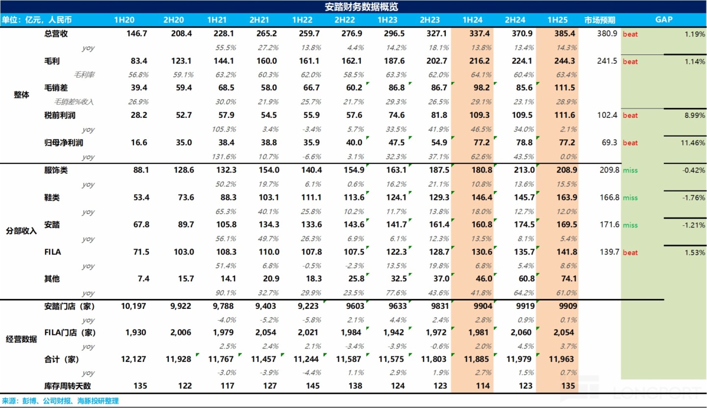 1.整體業績保持平穩。公司 25H1 實現總營收 385.4 億元,同比增長達到 14.3%,小超市場一致預期(381 億元)。但由於公司在電話會裡對安踏主品牌的指引從高單位數下調至中單位數,引發了市場對增長持續性擔憂,因此業績出來後股價有所回落。