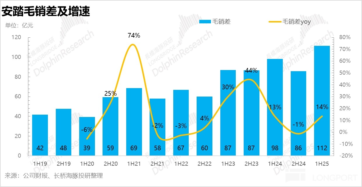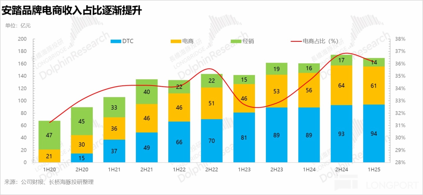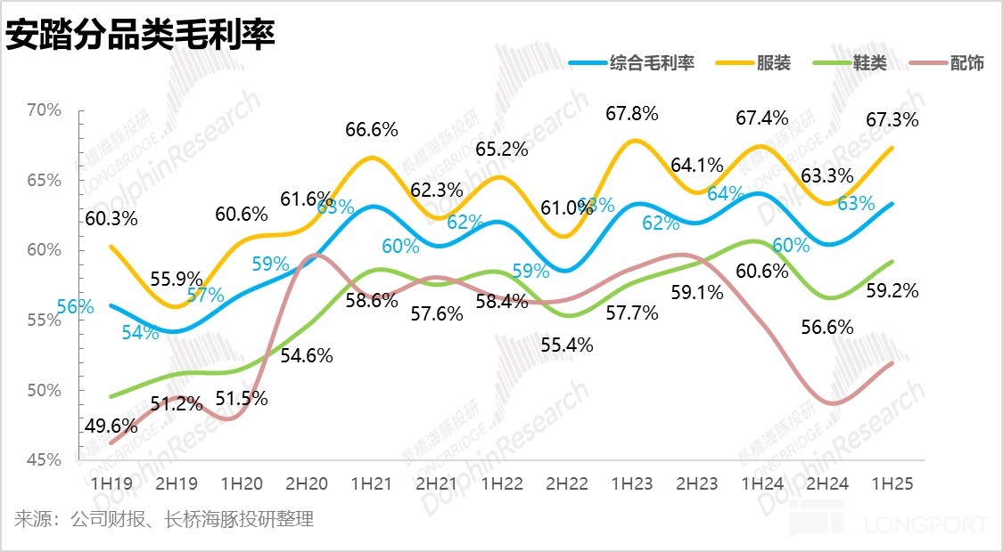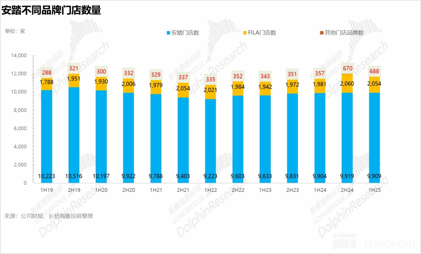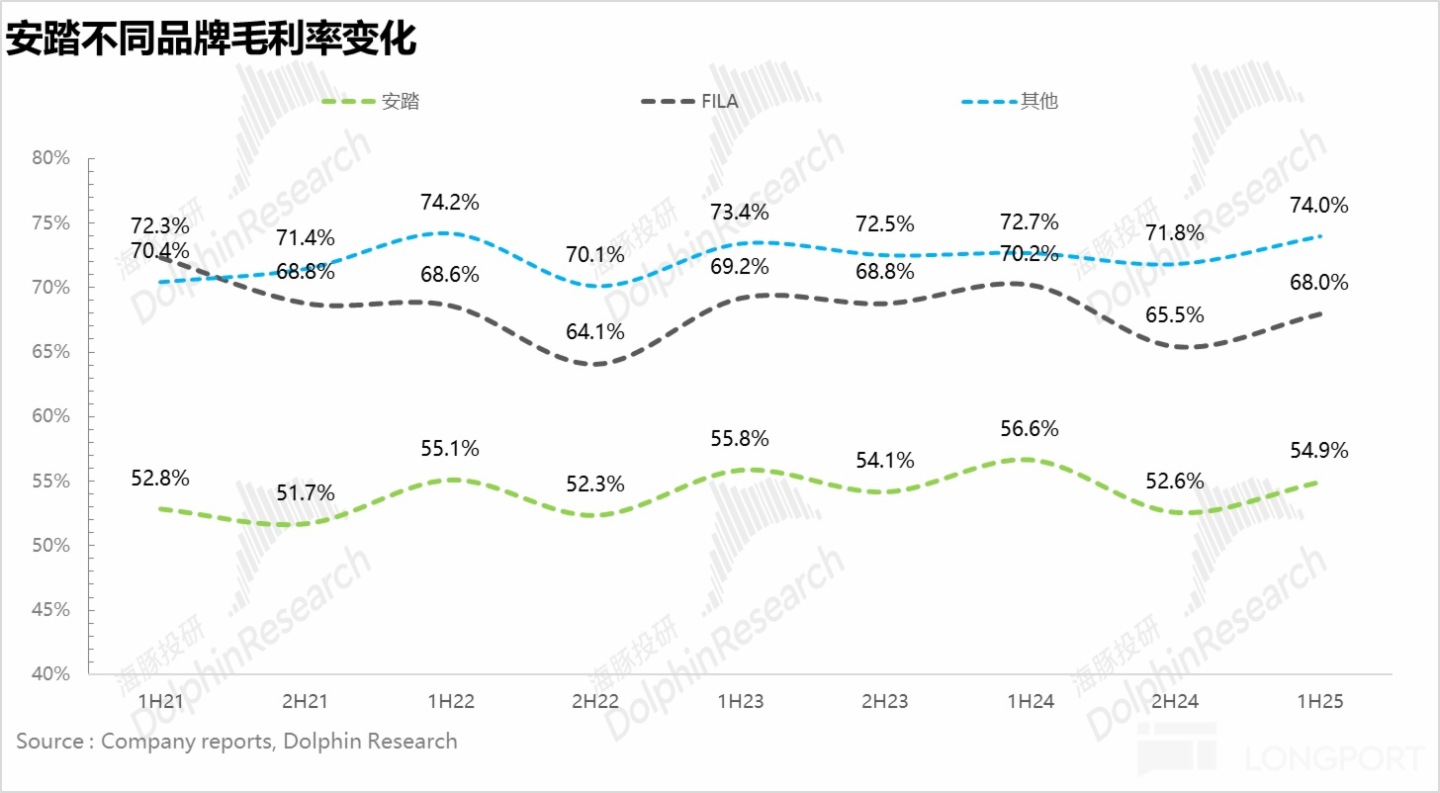 核心原因在於公司在二季度加速渠道升級,將一二綫城市旗艦店模式(如冠軍店、超級安踏店)下沉至低綫城市,導致大量門店關停改造,對低綫城市客流依賴度高的加盟店造成了比較大的影響。伴隨 Q3 完成改造後門店重新開業,海豚君認為下半年公司的門店流水有望逐步恢復常態。