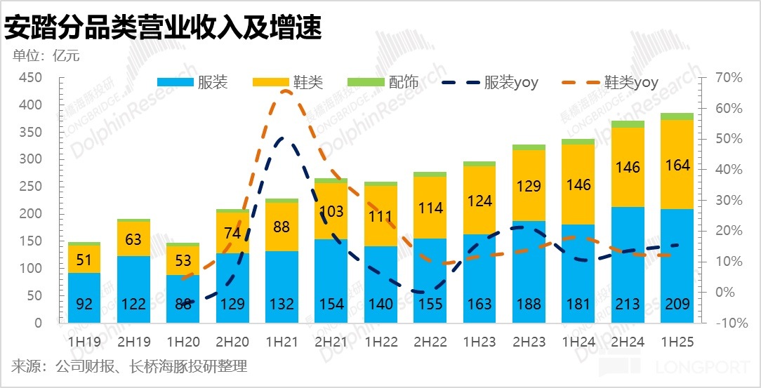 從品類上看,鞋類實現營收 163.9 億元,同比增長 12%,其中跑鞋品類銷量高增,PG7 跑鞋銷量超 200 萬雙,超出市場預期,籃球鞋、休閑鞋表現平平。