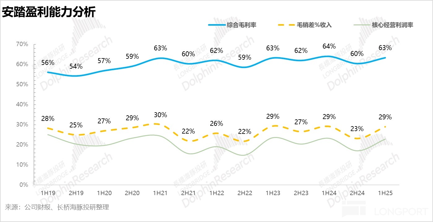 5、毛利率小幅下滑。從毛利率上看,由於安踏和 FILIA 均加大了綫上渠道的銷售佔比(折扣力度更大),因此帶動整體毛利率小幅下滑 0.7pct 達到 63.4%,