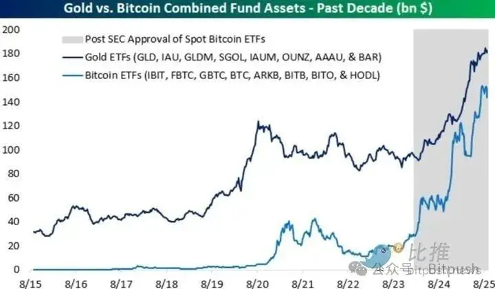 如果說波動率的下降是比特幣成熟的内在標誌,那麼現貨比特幣 ETF 的獲批和發行,則是加速機構採納的外部催化劑。這一裡程碑式的事件為普通投資者和機構打開了前所未有的投資通道,並直接引發了比特幣與黃金之間的一場“資産管理規模(AUM)”競賽。