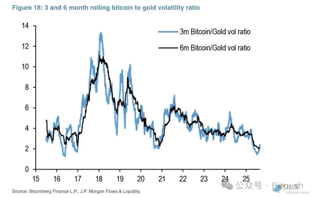 據摩根大通分析,比特幣六個月滾動波動率已從年初的近60% 爆降至約30%,創下歷史新低。與此同時,比特幣與黃金的波動率比率也降至歷史最低水平,現在比特幣僅為黃金波動率的兩倍。