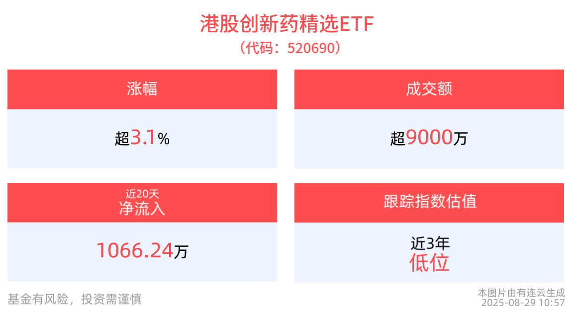 截至2025年8月29日 10:57,恒生港股通創新藥精選指數(HSSCPB)強勢上漲3.31%,成分股藥明生物(02269)上漲6.77%,信達生物(01801)上漲5.68%,石藥集團(01093)上漲5.19%,藥明康德(02359),藥明合聯(02268)等個股跟漲。港股創新藥精選ETF(520690)上漲3.20%,最新價報1元。