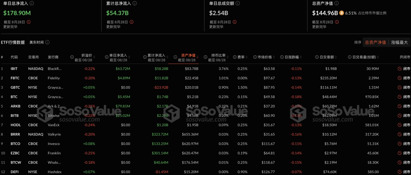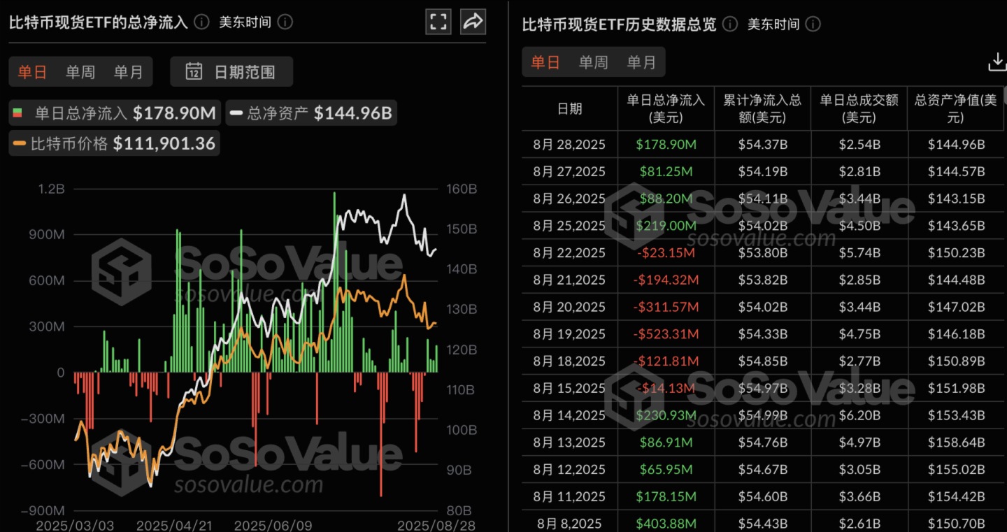 PANews 8月29日消息,根據 SoSoValue 數據,昨日(美東時間 8 月 28 日)比特幣現貨 ETF 總淨流入 1.79 億美元。