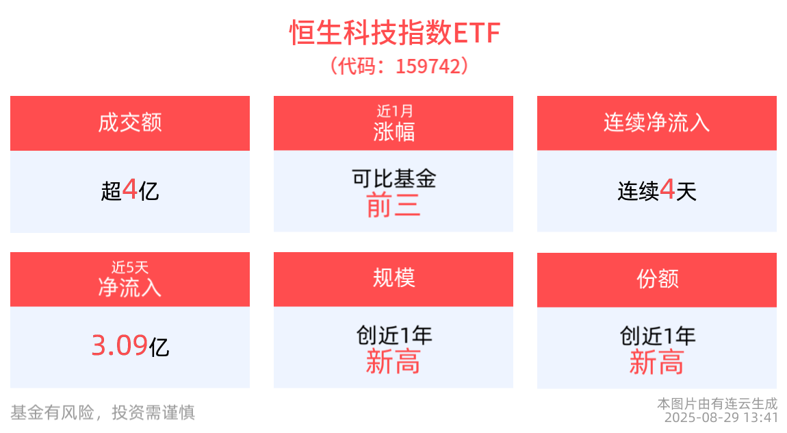 流動性方面,恒生科技指數ETF盤中換手12.78%,成交4.17億元,市場交投活躍。拉長時間看,截至8月28日,恒生科技指數ETF近1周日均成交6.18億元。