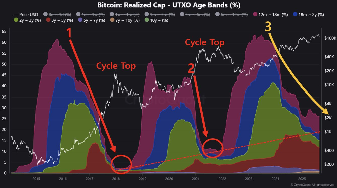 PANews 8月29日消息,CryptoQuant 分析師 Crypto Dan 表示,加密貨幣市場周期放緩,預計2025年秋季將迎來上升趨勢。從持有超過一年的比特幣比例(基於已實現市值)來看,過去的周期(第一階段和第二階段)顯示,市場大幅飙升並達到頂峰。然而,在當前階段(第三階段),上升趨勢的斜率正在逐漸趨於平緩,周期也變得更長。