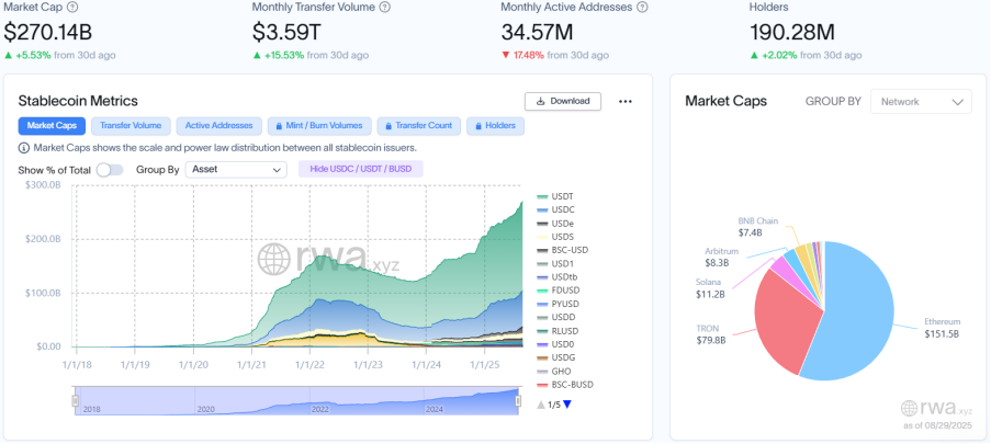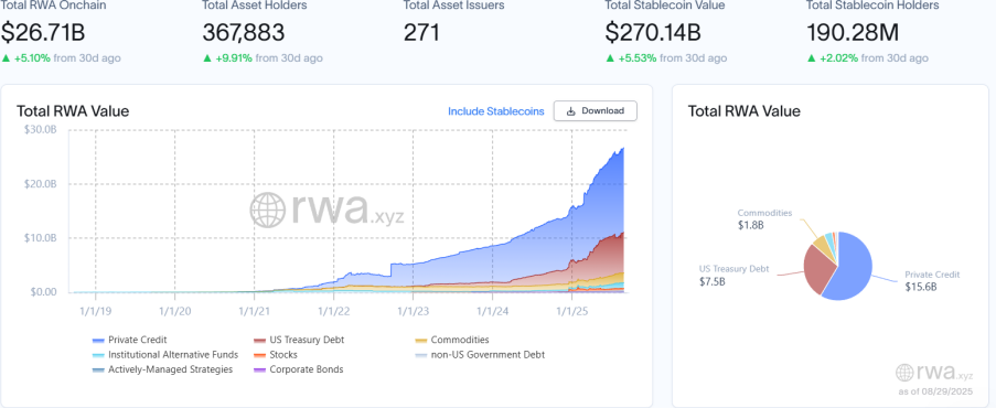 RWA.xyz 最新數據披露,截至2025年8月29日,RWA 鏈上總市值為267.10億美元,環比上月同期上升5.10%,延續穩健擴張態勢;資産持有者總數約36.79萬,環比上月同期上漲9.91%,資産持有者增速高於RWA鏈上總市值增速,反映中小投資者參與度提升;資産發行方總數增至271家,表明新發行機構入場加速生態多元化。