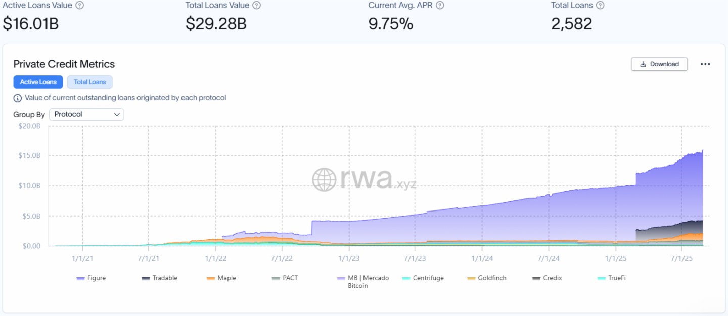 私人信貸市場未償貸款總額高達160.1億美元,約佔歷史累計發放總量292.8億美元的54.7%,當前平均年化利率為9.75%,顯著高於傳統公司債市場,反映鏈上信貸的流動性溢價及風險定價優勢;貸款總數2,582筆,平均單筆規模約620萬美元,印證機構級融資主導特徵。Figure是未償貸款總額及歷史累計發放總量最高的協議,規模分別為150.15億美元、117.71億美元。