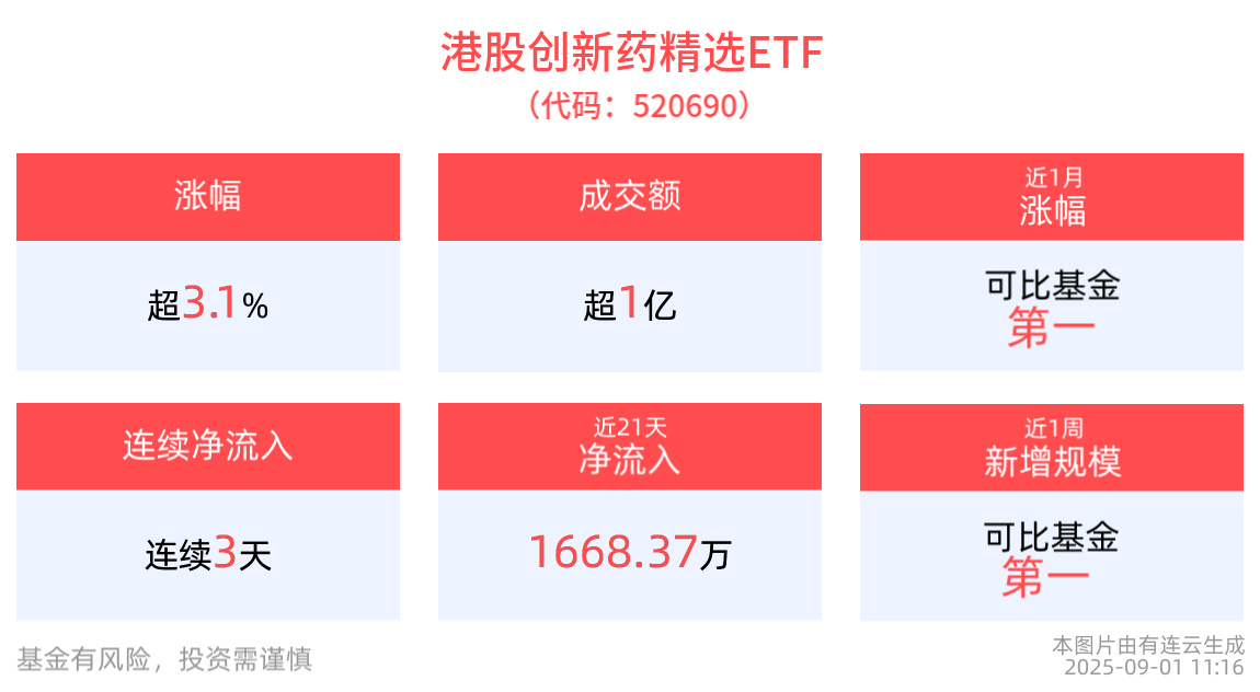截至2025年9月1日 11:16,恒生港股通創新藥精選指數(HSSCPB)強勢上漲4.33%,成分股信達生物(01801)上漲7.59%,晶泰控股(02228)上漲6.79%,康諾亞-B(02162)上漲6.44%,藥明康德(02359),石藥集團(01093)等個股跟漲。港股創新藥精選ETF(520690)上漲3.16%,最新價報1.05元。拉長時間看,截至2025年8月29日,港股創新藥精選ETF近1月累計上漲2.63%,漲幅排名可比基金1/2。