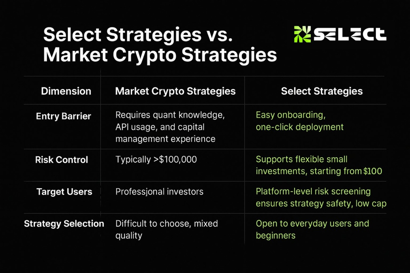 與市場傳統 Crypto 策略相比,Select 降低了資金門檻(100 U 起投)、簡化了入門流程(申購便捷、一鍵部署)、強化了風控安全(平台實時監測),讓普通用戶也能參與專業量化投資。