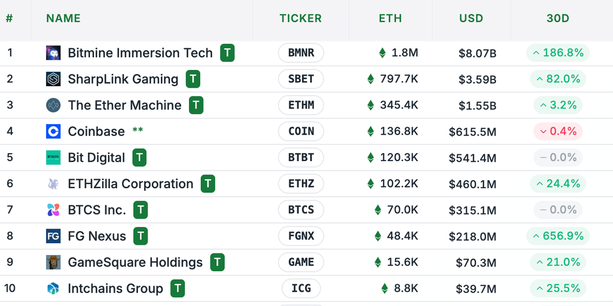 - SharpLink Gaming:79.7萬枚,30日内變動+82.0%