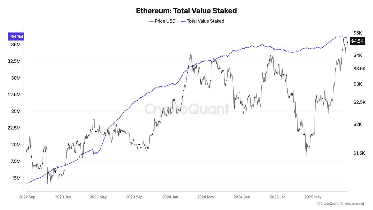 目前,已有約3613.7萬枚ETH在質押中,接近目前總供應量的30.1%,質押規模屢創新高。這些鎖定的ETH有效減少了流通供給,從供需層面減少了抛壓。