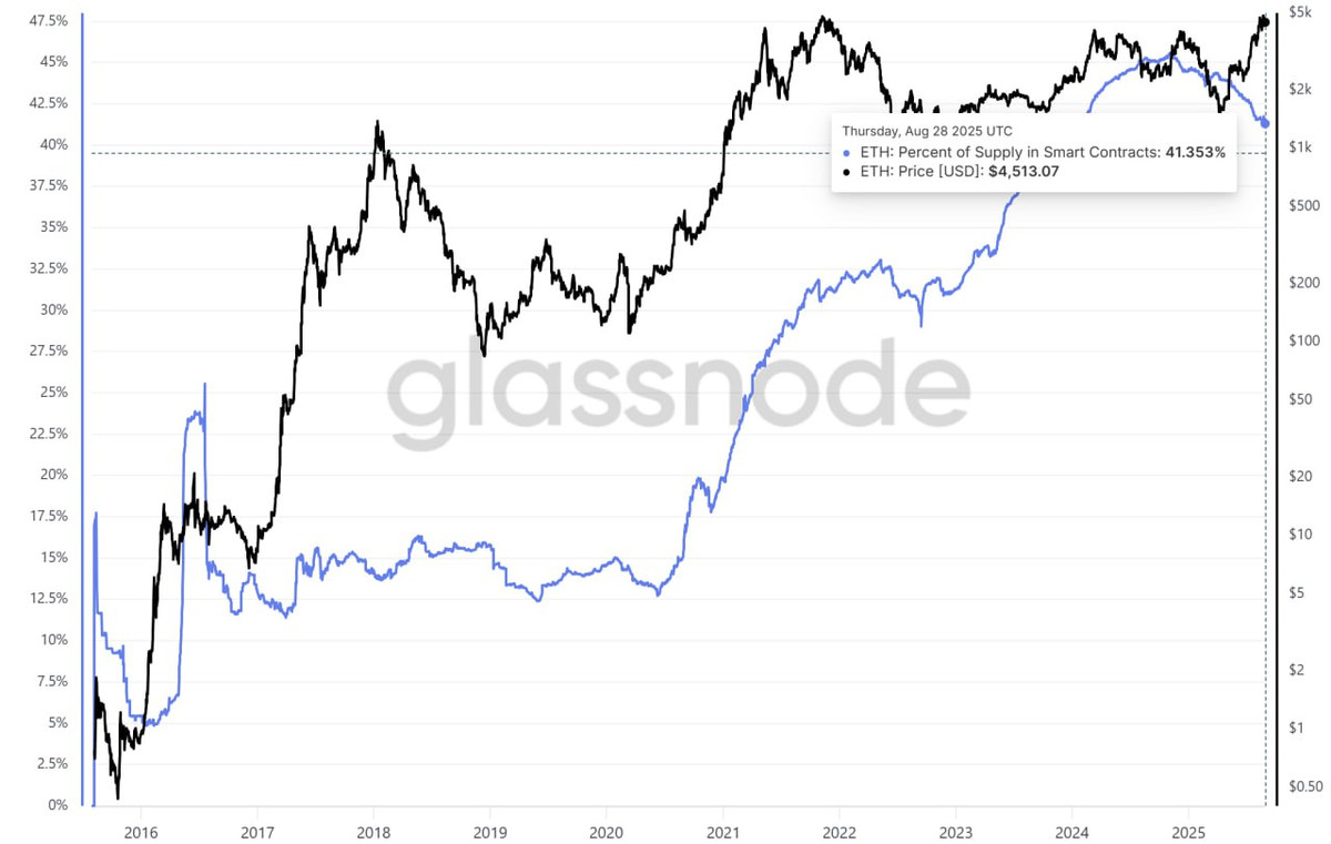 目前約41.35%的ETH已被鎖定在質押、DeFi等合約中,幾乎佔流通量的一半。
