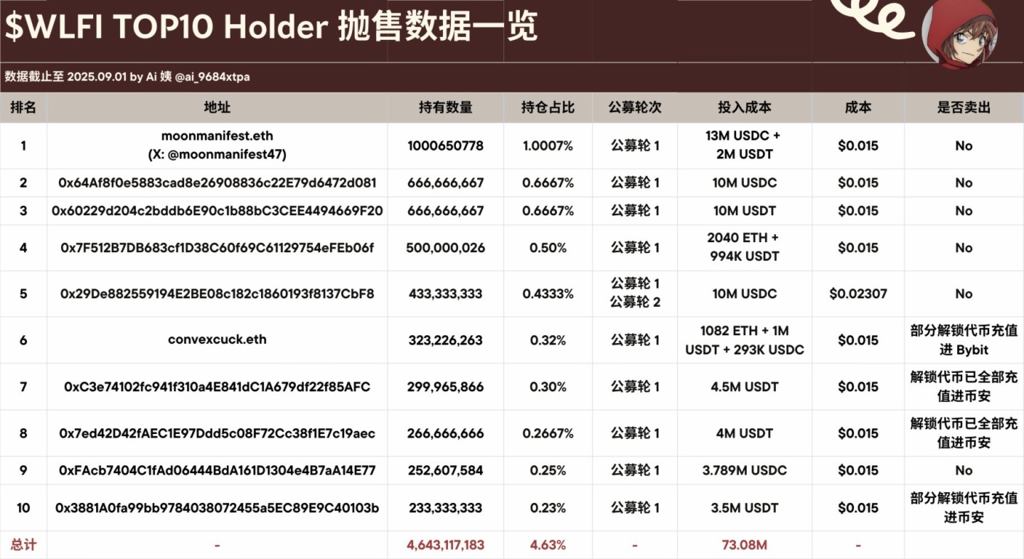 PANews 9月1日消息,據Ai 姨統計,WLFI代幣TGE後半小時,TOP10個人持有者中有4位(TOP6/7/8/10)選擇部分或全部賣出,其餘6位仍持有。賣出者均將代幣充值進交易所,未進行鏈上交易。4位持有者累計充值WLFI 18.6億枚,佔TOP10總持幣量4%,佔已解鎖部分總量20%。