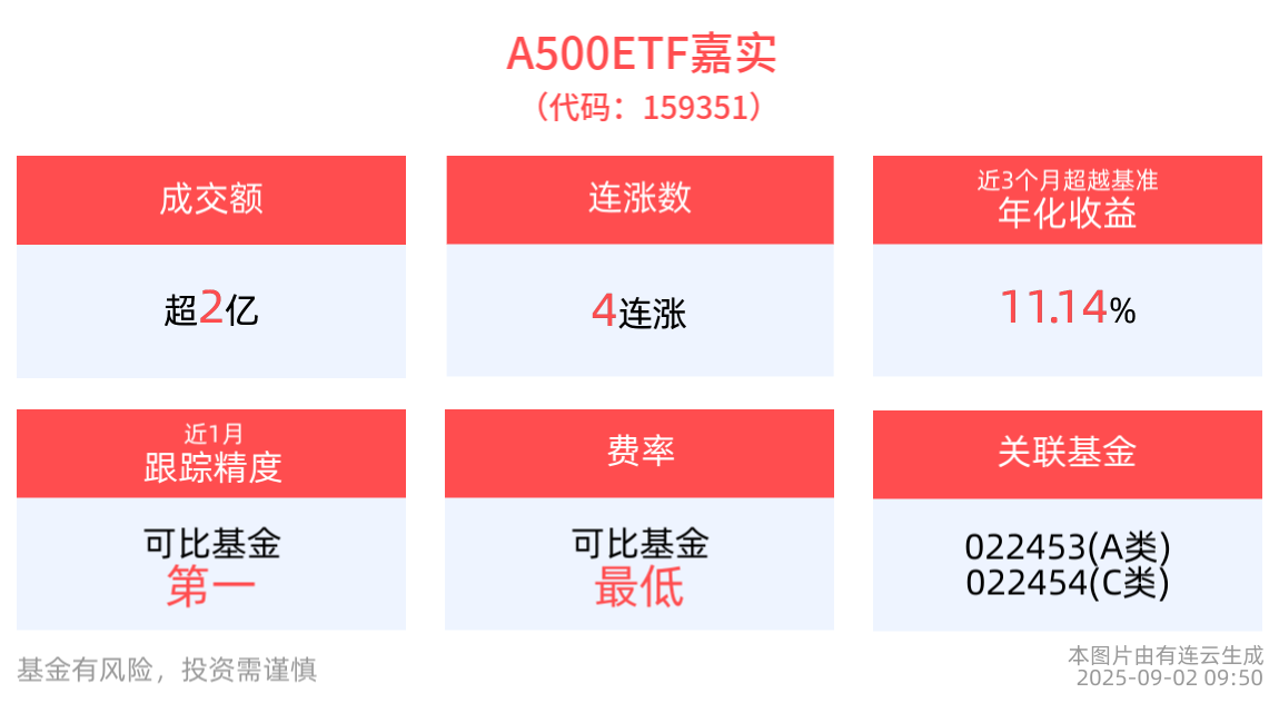截至9月1日,A500ETF嘉實近6月淨值上漲19.52%。從收益能力看,截至2025年8月29日,A500ETF嘉實自成立以來,最高單月回報為11.71%,最長連漲月數為4個月,最長連漲漲幅為22.93%。截至2025年9月1日,A500ETF嘉實近3個月超越基準年化收益為11.14%。