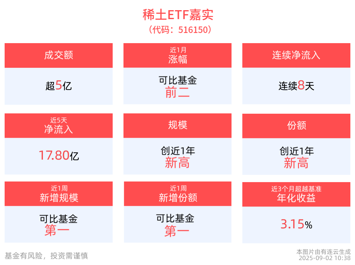 規模方面,稀土ETF嘉實最新規模達85.10億元,創成立以來新高,位居可比基金第一。份額方面,稀土ETF嘉實最新份額達47.34億份,創成立以來新高,位居可比基金第一。從資金淨流入方面來看,稀土ETF嘉實近8天獲得連續資金淨流入,最高單日獲得4.86億元淨流入,合計「吸金」24.45億元。