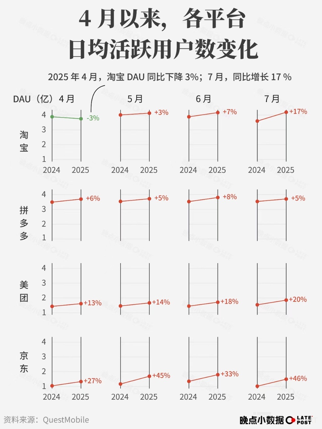 而阿裡因參戰較晚,到 7 月份隨著補貼發力,DAU 直接扭轉 4 月時的局勢,同比大漲 17%,顯著拉開了其在傳統電商内主要競爭對手拼多多的日活用戶差距。