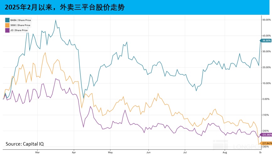 拉長視角,從 2 月以來(京東是在 2 月初正式上綫京東外賣)三家公司的股價走勢看,雖三者都一度受到外賣大戰以及特朗普關稅的影響,於 4 月上旬步調一致的明顯下跌。但不同的是後續:阿裡股價迅速回彈,並在以約$115 為中樞的價格區間上下震蕩,新一季財報發佈後的首個周一開盤,其港股大漲 18%,華爾街眾多投行普遍上調目標價至 170 美元上下,上行情景目標價高至 198 美元。