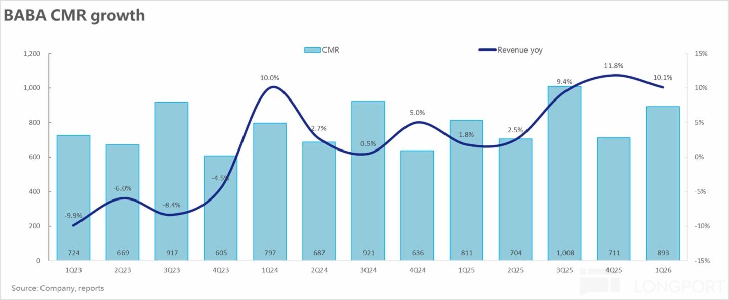 但電話會中阿裡管理層的表述則非常樂觀,預期 26 財年後續幾個季度 CMR 會保持和過去兩個季度相當的不俗增長。長期内更是預期後續淘寶閃購的交叉銷售,有望給 CMR 帶來 2%~3% 的潛在增量空間(對應超 100 億的年度增量收入)。後續實際情況是否如此只能交給時間驗證,只能說阿裡的管理層(根據他們能看到的數據和趨勢)是認為存在這個空間的。