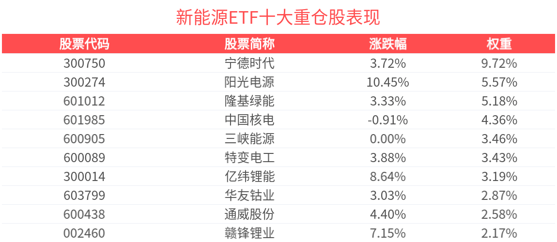 數據顯示,截至2025年8月29日,中證新能源指數前十大權重股分別為寧德時代、陽光電源、隆基綠能、中國核電、特變電工、億緯鋰能、華友钴業、三峽能源、通威股份、天齊鋰業,前十大權重股合計佔比42.78%。