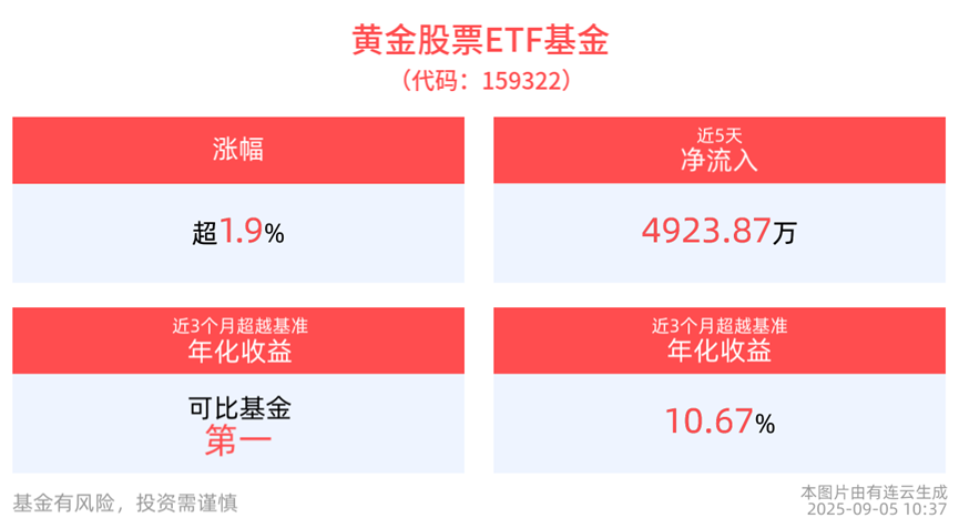 截至2025年9月5日 10:37,中證滬深港黃金産業股票指數(931238)強勢上漲1.85%,成分股湖南白銀(002716)上漲5.19%,西部黃金(601069)上漲4.17%,萬國黃金集團(03939)上漲3.63%,六福集團(00590),招金礦業(01818)等個股跟漲。黃金股票ETF基金(159322)上漲1.91%,最新價報1.44元。拉長時間看,截至2025年9月4日,黃金股票ETF基金近1周累計上漲7.71%。