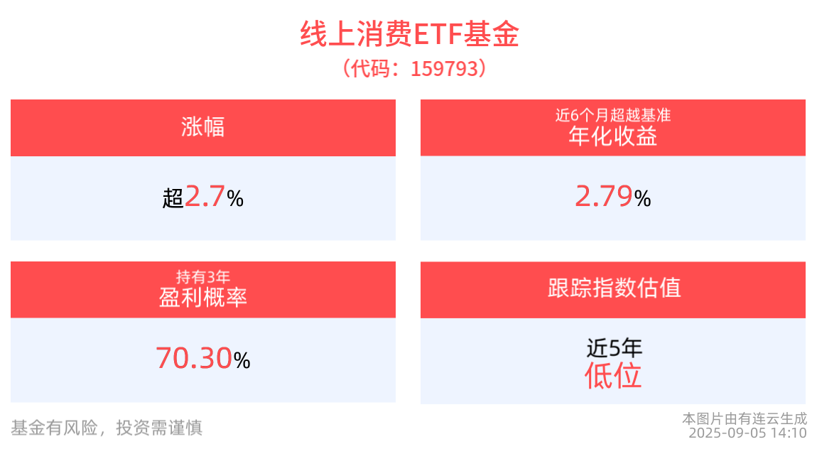 截至2025年9月5日 14:10,中證滬港深綫上消費主題指數(931481)強勢上漲1.45%,成分股中國電影(600977)上漲10.04%,巨人網絡(002558)上漲8.14%,萬潤科技(002654)上漲7.55%,芒果超媒(300413),姚記科技(002605)等個股跟漲。綫上消費ETF基金(159793)上漲2.71%,最新價報1.06元。拉長時間看,截至2025年9月4日,綫上消費ETF基金近1月累計上漲5.62%。