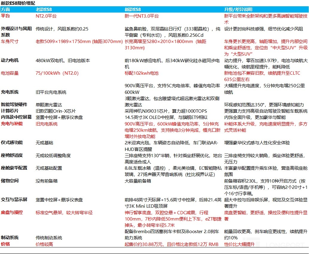 由於新款 ES8 從 NT2.0 平台切換到 NT3.0 平台,而 NT3.0 平台對高壓快充(800V 升級到 900V),電子電氣架構)從分佈式域控升級到中央計算架構,同時輕量化設計也大幅降低了能耗。