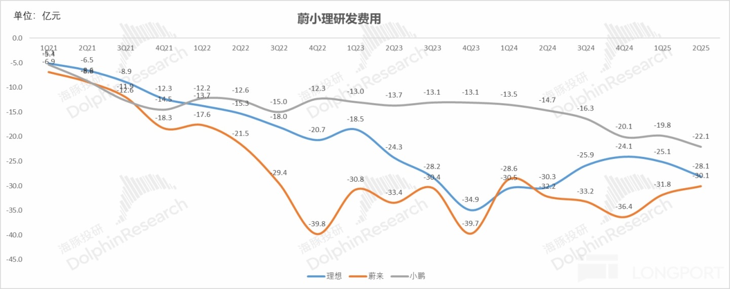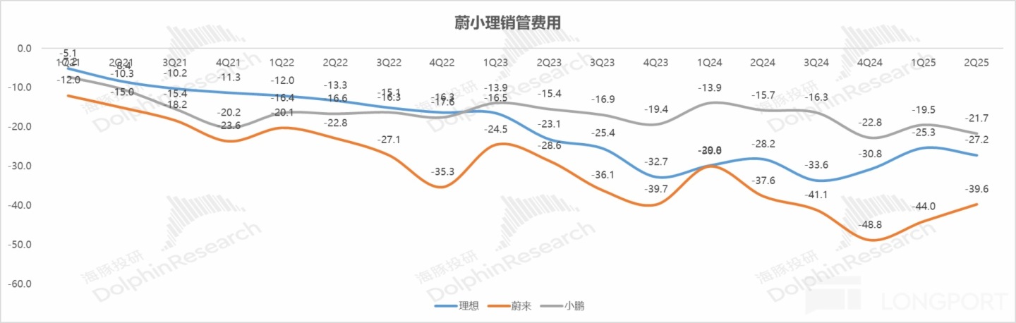 蔚來指引三季度因為新品推出,營銷費用下滑程度難,但到四季度,Non-GAAP 下的 SG&A 費用目標控制在銷售收入的 10% 以内,海豚君預計按照指引,四季度銷售費用將從二季度的 40 億元環比繼續下滑 5-6 億元至 34-35 億元。雖然仍高出理想和小鵬的銷管費用,但是蔚來主要用高端服務 + 豪華的 Nio house 來塑造高端品牌感,這部分費用繼續下調的空間不大。