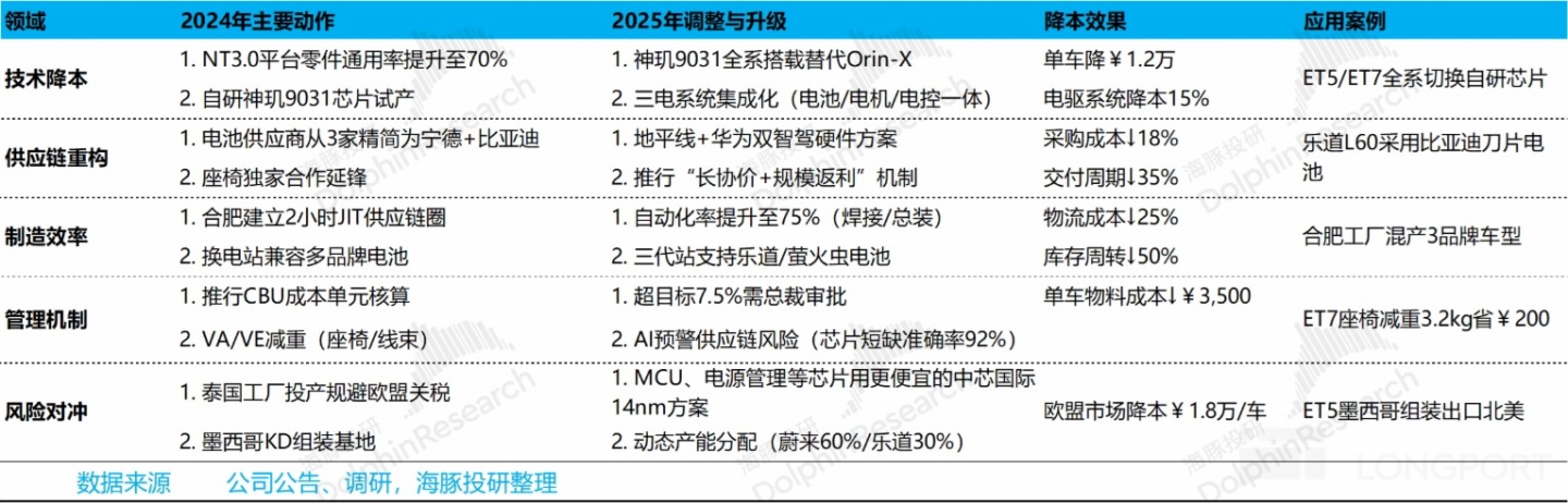 自研芯片降本:蔚來自研 NX9031 芯片,這也是成本降幅最大的地方,NT2.0 是 4 顆英偉達 Orin-X 芯片,每輛車成本降低 1 萬元,