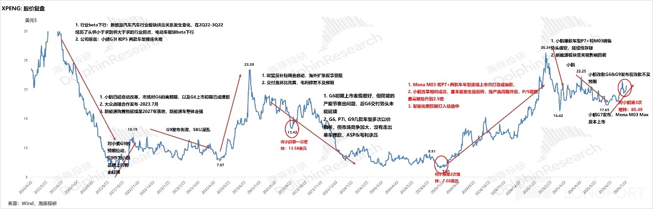 後 P7+ 和 Mona M03 上市,相比同級競品極具性價比,通過高性價比 + 高顔值 + 長續航 + 智能化優勢佔據市場,成功打造成爆款,而公司的本輪産品強周期從 2024 年一直持續到 2026 年,小鵬基本面發生了強反轉,這也帶動了小鵬的股價從最低點 7 美元迅速拉漲 276% 至 2025 年 1 月最高點 26 美元。