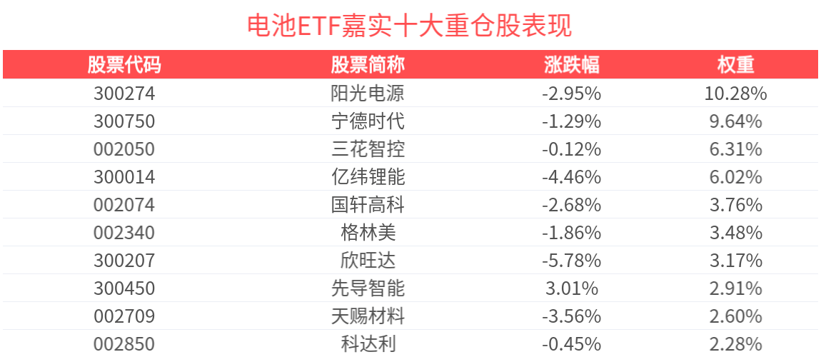 數據顯示,截至2025年8月29日,中證電池主題指數前十大權重股分別為陽光電源、寧德時代、三花智控、億緯鋰能、國軒高科、先導智能、格林美、欣旺達、銀輪股份、天賜材料,前十大權重股合計佔比53.03%。