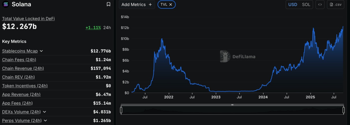 PANews 9月10日消息,據DefiLlama數據顯示,Solana生態係統的DeFi總鎖倉量(TVL)達到122.67億美元,較前日增長1.11%,創歷史新高。