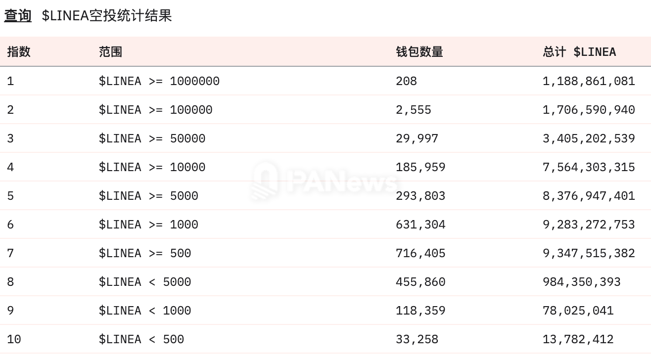 PANews 9月11日消息,據Dune數據,Linea本輪空投總量約為93.6億枚,符合條件的地址數為749,663個。其中,208個地址獲得100萬枚以上LINEA空投,最高地址0x399c…6e97a獲得137,403,894枚。其餘各檔位分佈為:10萬至100萬枚2,347個地址,5萬至10萬枚27,442個地址,1萬至5萬枚155,962個地址,5千至1萬枚107,844個地址,1千至5千枚337,501個地址,不足1千枚118,359個地址。