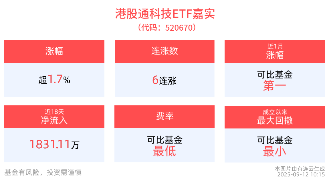 截至2025年9月12日 10:15,港股通科技ETF嘉實(520670)現漲1.71%,盤中一度漲超2%, 沖擊6連漲。成分股阿裡巴巴-W、哔哩哔哩-W漲超6%,優必選、金山辦公等跟漲。拉長時間看,截至2025年9月11日,港股通科技ETF嘉實近1周累計上漲6.48%,漲幅排名可比基金第一。