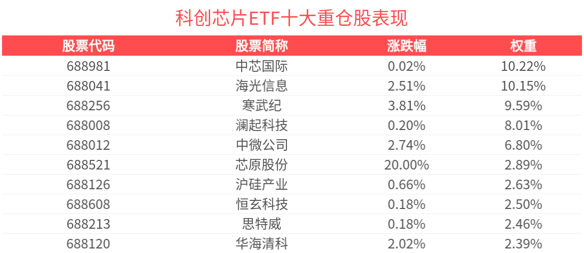 數據顯示,截至2025年8月29日,上證科創板芯片指數前十大權重股分別為寒武紀、海光信息、中芯國際、瀾起科技、中微公司、芯原股份、東芯股份、滬矽産業、晶晨股份、恒玄科技,前十大權重股合計佔比62.02%。
