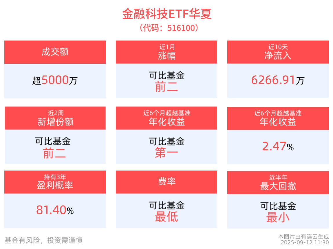 金融科技ETF華夏(516100),場外聯接(華夏中證金融科技主題ETF發起式聯接A:023884;華夏中證金融科技主題ETF發起式聯接C:023885)。