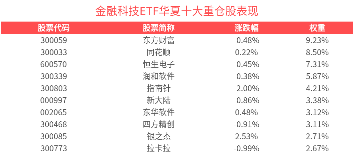 數據顯示,截至2025年8月29日,中證金融科技主題指數(930986)前十大權重股分別為同花順(300033)、東方財富(300059)、恒生電子(600570)、指南針(300803)、潤和軟件(300339)、東華軟件(002065)、銀之傑(300085)、新大陸(000997)、四方精創(300468)、廣電運通(002152),前十大權重股合計佔比54.08%。