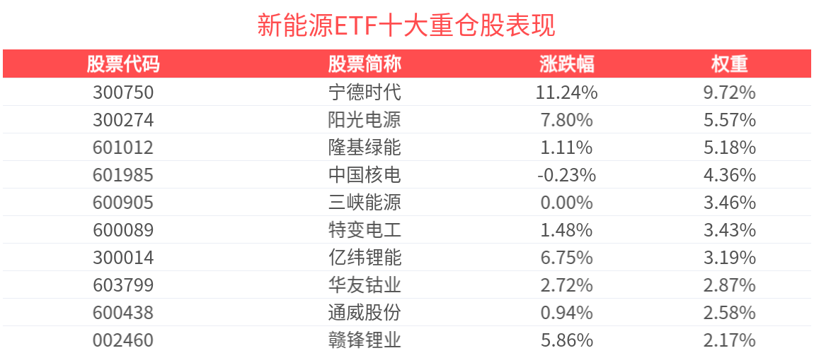 數據顯示,截至2025年8月29日,中證新能源指數前十大權重股分別為寧德時代、陽光電源、隆基綠能、中國核電、特變電工、億緯鋰能、華友钴業、三峽能源、通威股份、天齊鋰業,前十大權重股合計佔比42.78%。