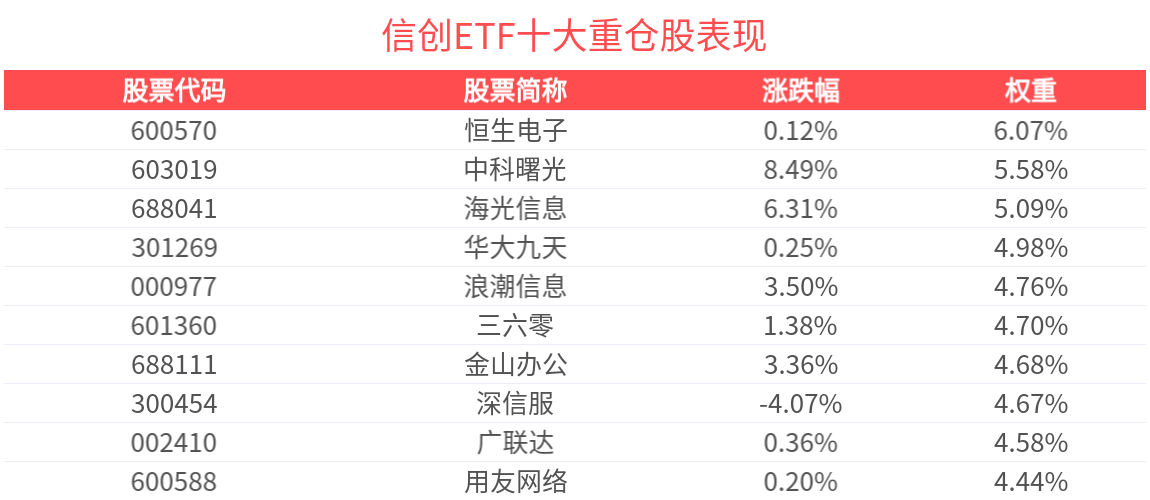 數據顯示,截至2025年8月29日,中證信息技術應用創新産業指數(931247)前十大權重股分別為中科曙光(603019)、海光信息(688041)、恒生電子(600570)、深信服(300454)、浪潮信息(000977)、金山辦公(688111)、用友網絡(600588)、三六零(601360)、廣聯達(002410)、華大九天(301269),前十大權重股合計佔比50.4%。