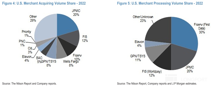 以美國市場作為驗證,收單行業的市佔率是相當分散的,門檻相對較低(只要能招攬到商戶就行)。相比之下中台的支付處理市場則相當集中,前兩大玩家就佔據越一半的份額。因此,多數情況下支付收單方相比其上遊的議價能力是弱勢方。
