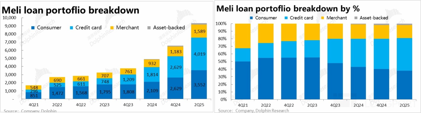 b. 趨勢上,除了信用卡貸款的平均規模有明顯和持續的走高趨勢外,商家和消費貸的人均規模甚至曾經呈下降趨勢,在近幾個季度才有觸底回升的趨勢。這意味著,Meli貸款業務總規模的增長絕大部分是由貸款用戶的數量增長驅動的,而不太靠平均貸款規模的提升驅動。再度驗證了通過電商和其他金融業務獲客的重要性。