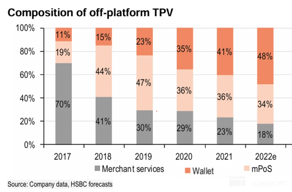 根據公司早年間的披露並結合賣方的預測,綫下支付(mPOS)和數字錢包自推出後,在體係外支付額中的比重快速上升,從2017年的合計30%到2022年的超80%。而體係外綫上支付的比重連年下滑,重要性相對較低。