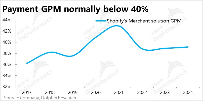 從上市公司披露的財務指標上同樣可見這個結論,雖然Meli自身並不單獨披露支付業務的利潤數據,但海豚其他覆蓋的公司中, Shopify的商家服務收入中約70%以上是支付手續收入,而其毛利率常年僅在35%~40%+之間波動,相比其他輕資産模式業務如廣告等動辄60%甚至更高的毛利率水平,支付業務的利潤率確實較低。