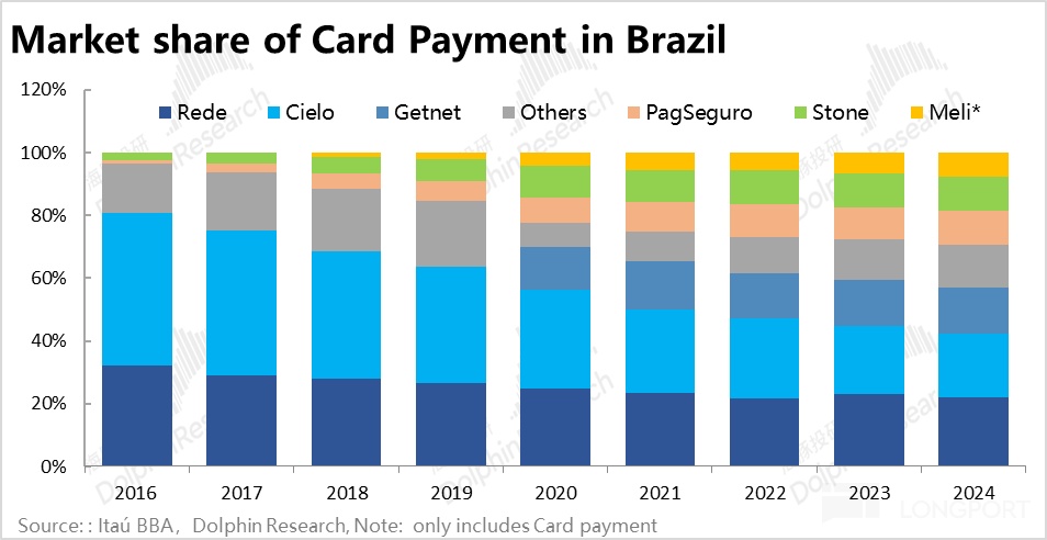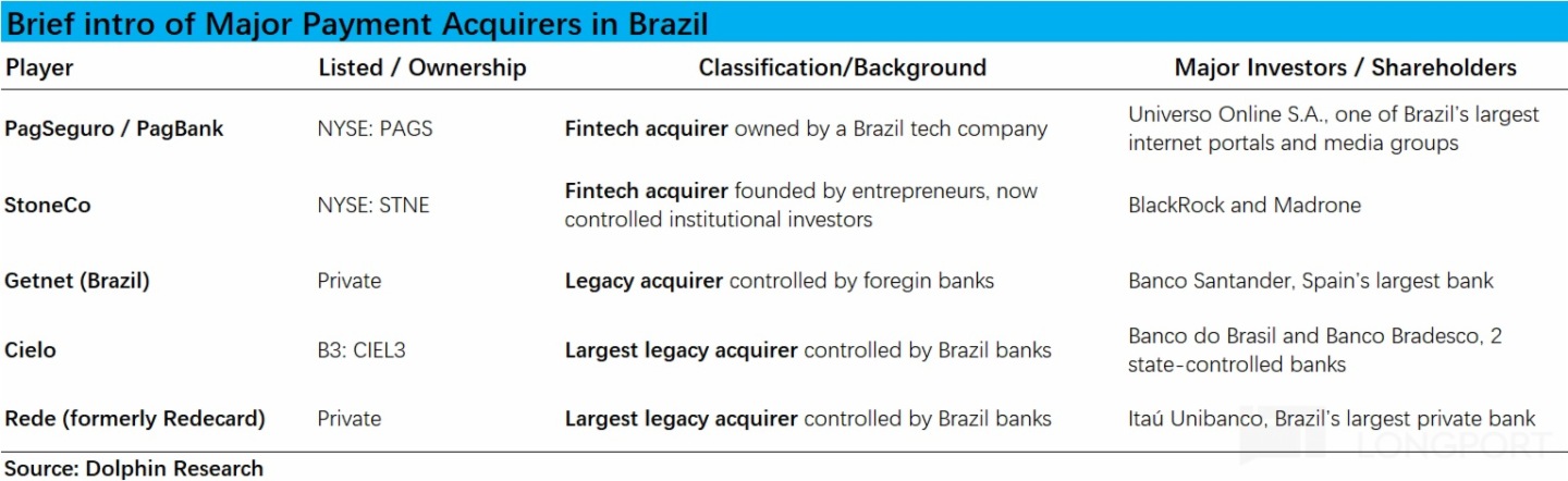 競爭格局上,目前巴西支付行業内,有5個主要的支付收單商,可以大致區分為兩類:a. 第一類是由傳統金融機構控制的收單商,包括Cielo,Rede和Getnet,他們背後的主要投資/控制人都是巴西頭部的大銀行;b. 第二類無金融背景,跨界進入支付的Fintech型支付收單商,包括Meli旗下的Pago,以及PagBank 和 Stone。
