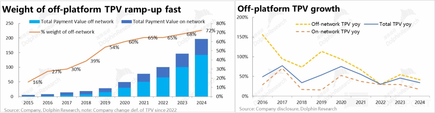 根據公司的披露,在2015~2024的十年間,體係外支付額的佔比快速從16%拉升到72%,且「巧合」地在體係内支付滲透率逼近100%的2020年前後,體係外支付佔比正巧過半及時接過了繼續推動整體支付額保持較高增長的職責。
