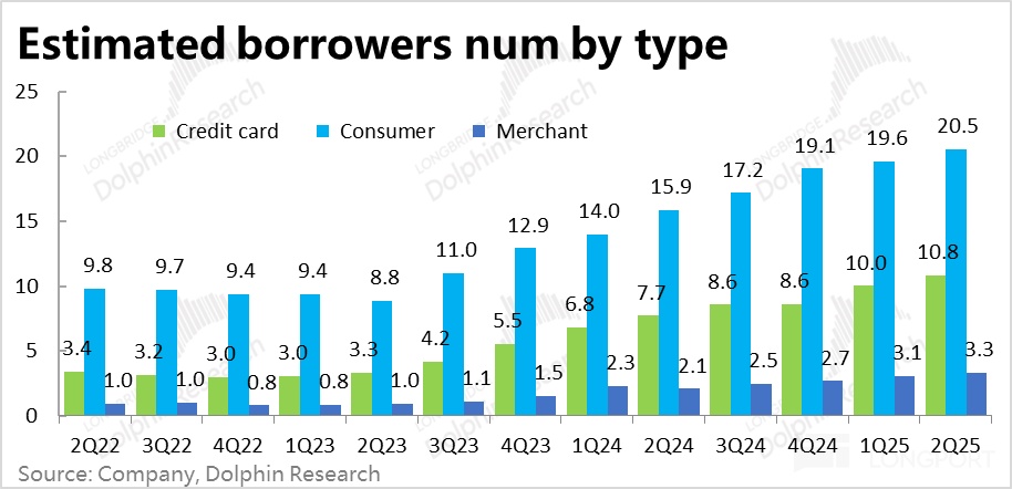 a. 消費貸的用戶體量最大,在2Q25已達2050萬人,佔到公司季度活躍電商買家數量的約1/3。不過,這也因為消費貸款中近一半是消費者在綫上平台内購物使用的先買後付功能。