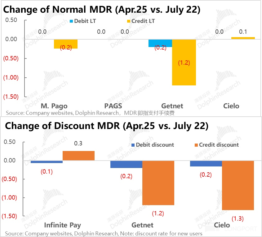 18年之後至今,雖然海豚沒有看到類似的行業數據,但根據各主要收單公司公佈的費率對比,多數情況下2025年的費率相比2022年還是走低的。整體上支付手續費率仍保持著下行趨勢,但下行的幅度有所趨緩。
